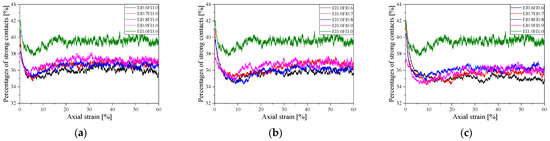 If the normal contact force is greater than the average contact force , it is defined as a strong contact. Figure 17 shows the strong contact-strain curves under different EI and FI at a lateral pressure of 200 kPa. It can be observed that the trends of all specimens are similar, with the proportion of strong contact forces decreasing rapidly at the beginning of shear, then slightly recovering to fluctuate within a relatively stable range. The proportion of weak contact forces is minimal, less than 50%, and weak contact forces dominate the entire contact network. Except for the ideal spherical particle aggregates, the proportion of strong contact forces in other specimens remains around 36% at the critical state and is relatively stable throughout the loading process.