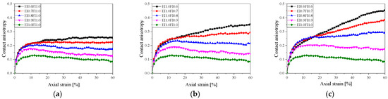 Figure 18 shows the deviatoric fabric–axial strain curves of thirteen different gravel shapes at 200 kPa. When the axial strain is less than 5%, the anisotropy of the specimen rises rapidly, and when the axial strain is greater than 5%, the slope of the curve decreases as the EI and FI increase, and the anisotropy of the specimen increases in the critical state. This means that the particles’ contact directions are more parallel to the Z axis during shear. Both EI and FI influence the anisotropy of the particle aggregate, with FI exerting a more pronounced effect.