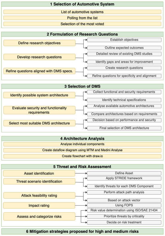 - It provides a comprehensive Threat Analysis and Risk Assessment (TARA) tailored explicitly to a representative, modern DMS architecture, systematically applying the methodology outlined in the ISO/SAE 21434 standard;
