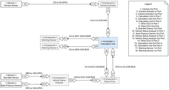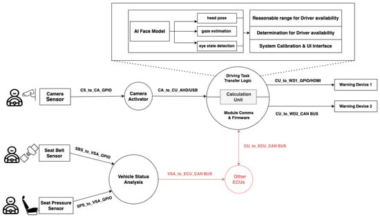 The Calculation Unit acts as the central hub for all information and all dataflows incoming from the sensors. It also acts as the key decision maker for all actions performed by the system. In the original architecture proposed in [7], this device is an embedded platform containing an Nvidia JETSON XAVIER NX processing unit. This unit was designed for use in autonomous machines and is capable of accessing up to six cameras and numerous sensors using a wide array of serial and network connections, like Peripheral Component Interconnect Express (PCIe), Universal Serial Bus (USB), Gigabit-Ethernet, CAN, SPI, and UART [28]. The Camera Activator uses USB for data transmission to the Calculation Unit. The NVIDIA JETSON features the “Deep Learning Accelerator (DLA)” [29] technology, which supports real-time data processing in the AI model pipe, as proposed in the architecture. The image data from the camera is used to calculate the head pose and estimate the gaze and eye state. In addition, the configuration of this device is stored, allowing interaction with the system via a user interface. The computing unit acts as the ECU of the DMS and is connected to the other ECUs in the vehicle via the CAN bus.