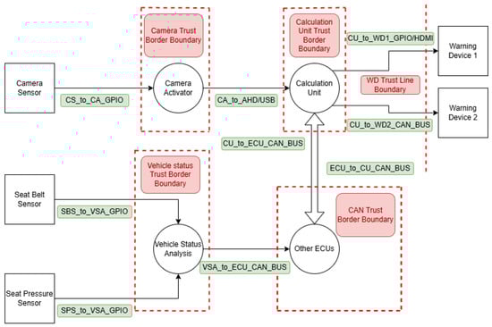 This phase focused on dissecting the selected DMS architecture to understand its internal components, operational flow, and exposure to cyberthreats. Key elements such as data collection modules, communication protocols, and access points were examined. Particular attention was given to safety-related sensors (e.g., seat pressure and seat belt status), which play a pivotal role in contextualizing driver behavior. Threat-modeling techniques were then applied to the identified system components to characterize potential security weaknesses. Visual models such as dataflow diagrams were created using Ansys Medini Analyze and Microsoft Threat Modeling Tool (MTM), enabling a detailed representation of asset interconnections and communication pathways. These models facilitated the identification of critical zones susceptible to attack vectors or data compromise. A complete version of these threat modeling diagrams, including the STRIDE model created with Medini Analyze, is provided in the Supplementary Materials.