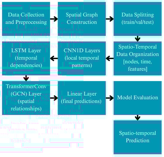 The proposed model (see Figure 1) integrates three core components: one-dimensional convolutional (CNN1D) layers to extract local temporal patterns, a Long Short-Term Memory (LSTM) layer to model more complex and long-range temporal dependencies, and a TransformerConv (Graph Convolutional Network) layer, which employs attention mechanisms to emphasize relevant spatial relationships between stations. A final linear layer produces the output prediction by integrating the extracted spatiotemporal features.