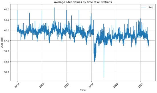 Time series of the average noise level (LAeq) recorded by all stations in Madrid during the study period. Seasonal patterns are observed, as long with weekends, and an abrupt drop in 2020, associated with the reduction in mobility due to the COVID-19 pandemic.