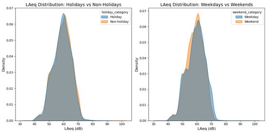 The plots in Figure 4 illustrate the distribution of the equivalent sound pressure level (LAeq) under different conditions: holidays versus non-holidays (left) and weekdays versus weekends (right).