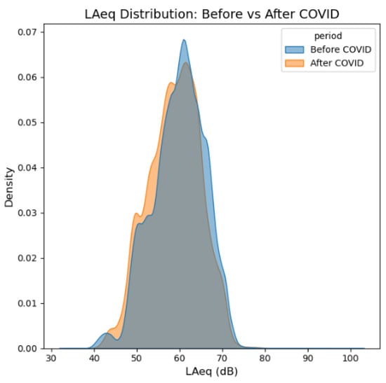 Distribution of noise level (LAeq) before and after the COVID-19 pandemic. A shift towards lower values is observed after the pandemic, suggesting a generalized reduction in urban noise pollution due to changes in mobility and social activity.