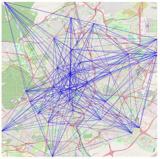 Representation of the spatial graph constructed from the acoustic measurement stations in Madrid. Each node corresponds to a station, and the edges connect the 15 nearest neighbors according to geodetic distance (Haversine), capturing the urban spatial structure relevant for GCN modeling.
