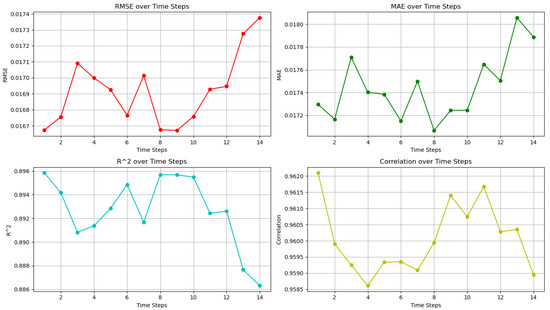 In Figure 7, we observe how the evaluation metrics change across different prediction horizons. Both RMSE and MAE increase slightly as longer-term intervals are predicted, indicating a slight reduction in accuracy for more distant time steps. Correlation and R2 remain high for most steps but also exhibit a slight decline in the longer forecast horizons.