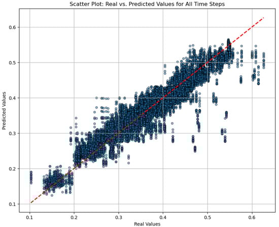 When analyzing the results, it is observed that the model CNN1D+LSTM+ TransformerConv outperforms the others in all evaluation metrics, obtaining the lowest RMSE (0.0169) and the highest R2 (0.8927). In addition, this model achieves the highest correlation (0.9601) and accuracy (0.9158), indicating a superior ability to capture the complex spatio-temporal relationships in noise data. Our model, like GraphSage+LSTM or CNN3D+LSTM, is designed to capture spatio-temporal relationships, but the main difference is that CNN1D+LSTM+TransformerConv captures temporal relationships first and then spatial ones, which could explain its superior performance. In comparison, models like GraphSage+LSTM and GraphSage show relatively good performance, with an RMSE of 0.0294 and correlations close to 0.9. These results indicate that the explicit combination of spatial information via graphs and temporal dependencies via LSTM provides significant predictive value. However, the precision and predictive capacity of these simpler approaches are limited compared to the proposed hybrid model. On the other hand, the CNN3D+LSTM and GAT models show lower performance, with higher errors (RMSE of 0.0340 and 0.0361, respectively) and lower correlation. This may be due to the fact that these architectures fail to effectively capture spatial and temporal relationships simultaneously, possibly due to their structural complexity or limitations in spatial information processing. A noteworthy aspect is the performance of the simple LSTM model, with an RMSE of 0.0305 and a correlation of 0.8939. This suggests that temporal dependencies are key in predicting noise levels and that purely sequential models can capture much of this complexity without explicitly incorporating spatial components. Regarding model performance over multiple time steps, the RMSE fluctuates during the first 10 steps and then shows a steady increase, suggesting a decline in predictive capacity for more distant steps. MAE behaves more erratically, with noticeable peaks around steps 4 and 13, indicating that the model struggles to capture specific patterns. R² remains high (0.89) for most steps but shows a slight decreasing trend after step 10, confirming a decline in explanatory power over longer horizons. Correlation initially decreases until step 4, then fluctuates with a peak around step 10, and decreases again in later steps, suggesting difficulty maintaining a linear relationship between real and predicted variables as the forecast horizon is extended. Nevertheless, the metrics and predictions remain accurate, with relatively low error margins. The following figure shows a scatter plot of actual versus predicted values for all time steps. Most points cluster around the red diagonal line, indicating good overall model performance. Although the model captures the general trend, it struggles to precisely predict some extreme values. It is likely that specific and anomalous events, such as protests or other activities that generate noise peaks, challenge the model’s predictive ability. Unfortunately, adding variables to help the model anticipate these social factors is difficult due to their variability and unpredictability. When evaluating the model’s predictive ability for the L1 variable (representing noise peaks), we found that R2 drops to 0.7046 and correlation decreases to 0.8892, compared to the 0.8927 and 0.9601 obtained for LAeq. This indicates that although the model can adequately predict average noise levels, its accuracy decreases for extreme events. Interestingly, the RMSE and MAE for L1 remain relatively similar, suggesting that the model’s errors relate more to its ability to capture extreme fluctuations than to general prediction errors. These results highlight the need to explore additional methods that help the model better anticipate anomalous peaks, such as using external data or models specialized in anomaly detection. Nonetheless, as shown in the Figure 8, the results fit the real values quite well.