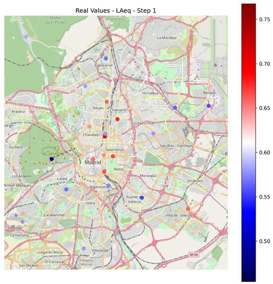 Example of real noise level (LAeq) data recorded by Madrid stations at a specific time instant.