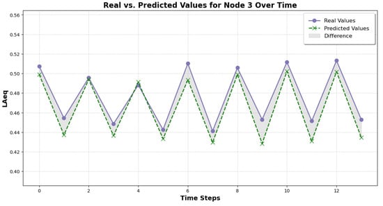 Prediction example for a specific node using CNN1D+LSTM+TransformerConv. Each time step represents 12 h intervals, differentiating between daytime and nighttime. The vertical axis indicates noise levels.
