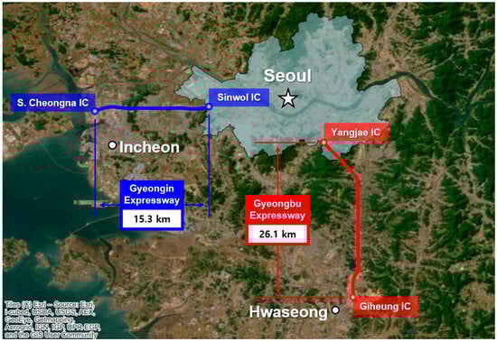 The major expressways in the Seoul metropolitan area of South Korea have exceeded their originally planned capacity, preventing them from fully functioning as highways. However, conventional expansion methods to increase road capacity are virtually impossible due to the urbanization surrounding these expressways. In this context, underground expressway projects could serve as an effective solution. The underground expressway projects for the section of the Gyeongbu Expressway between Giheung IC and Yangjae IC, and the section of the Gyeongin Expressway between South Cheongna IC and Sinwol IC (Figure 1), have passed preliminary feasibility evaluations and are scheduled to begin construction in 2027.