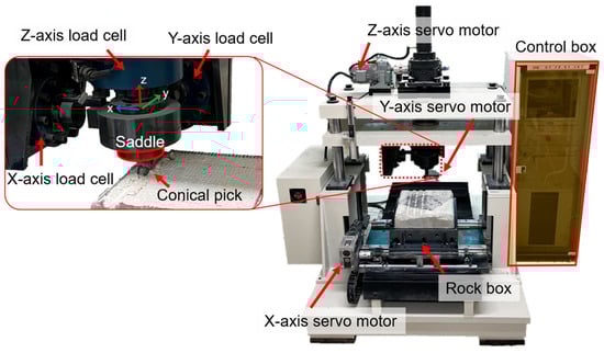 In this study, cutting tests were performed using a laboratory-scale LCM, as shown in Figure 3. The machine operates with three-axis servo motors. The x- and y-axis servo motors have stroke lengths of 500 mm and 700 mm, respectively, allowing precise control of the rock box movement. The z-axis servo motor drives the saddle, enabling vertical movement of the conical pick. Three orthogonally arranged load cells are employed to measure the tool forces exerted on the conical pick during cutting. The side force (FS) is measured by the x-axis load cell, while the normal force (FN) and cutting force (FC) are recorded by the y-axis and z-axis load cells, respectively. Tool force data are acquired at a sampling rate of 10 Hz and stored in CSV format. The control box provides real-time force visualization and allows configuration of cutting parameters.