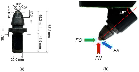 The conical pick used in the rock cutting tests was the SM06 model manufactured by Kennametal (Pittsburgh, PA, USA), as shown in Figure 4. This pick has a total length of 87.2 mm, with a gauge length of 45.3 mm and a tip angle of 90°. To eliminate the influence of tool orientation, the attack angle was fixed at 45°, while both the skew and tilt angles were set to 0°.