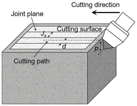 The influence of joints in rock cutting by a conical pick was investigated through a series of unrelieved cutting tests. Figure 5 shows a general view of the cutting test, along with the experimental variables considered in this study. Rock cutting tests were conducted on jointed rock mass specimens with joint spacings (Js) of 30 mm, 60 mm, and 90 mm. Cutting depths (p) were set to 3 mm, 6 mm, 9 mm, and 12 mm. To evaluate the effect of the distance from the joint plane (d), the cutting path was positioned at offsets ranging from 0.1Js to 0.5Js from the joint plane, with a cutting length of approximately 160 mm. After each test, the resulting cutting surface was scanned using a Calibry Mini 3D scanner by Thor3D (Moscow, Russia) to capture the cutting groove profile.