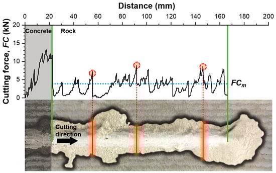 The mean cutting force (FCm) was calculated based only on the cutting force generated during rock cutting, excluding the portion associated with concrete cutting. Crack propagation characteristics were analyzed in cases where larger rock chips were generated. According to Yasar and Yilmaz [37], when the cutting force peaks, it is considered an indicator of large chip formation. In this context, plots of cutting force versus cutting distance were synchronized with the 3D-scanned cutting groove to identify the positions where peak forces occurred. At these peak locations, transverse profiles of the cutting groove were extracted and analyzed using Rhino 7 (Robert McNeel & Associates, Seattle, WA, USA) to examine the corresponding crack propagation behavior (Figure 6).