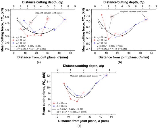 Therefore, to examine the general relationship between FCm and d independent of joint spacing, a regression curve was fitted using all data points except those at d = 0.5Js, where joint effects were considered negligible. The results confirmed that FCm and d exhibit a quadratic relationship for all cutting depths. All fitted regression curves were statistically significant at the 99% confidence level, as the R2 values were greater than 0.5, the F-values exceeded 5, and the p-values were less than 0.05. Notably, FCm reached its minimum value at approximately d = 20 mm across all cutting depths, suggesting that joint effects are most significant within this range. When viewed in terms of the ratio d/p, the minimum FCm was found to occur at lower d/p values as the cutting depth increased. Considering that the optimal ratio of line spacing to cutting depth (s/p) for achieving high cutting efficiency with conical picks under relieved cutting conditions typically ranges between 2 and 5 [38], this trend implies that the relative influence of joints tends to decrease as the cutting depth increases.