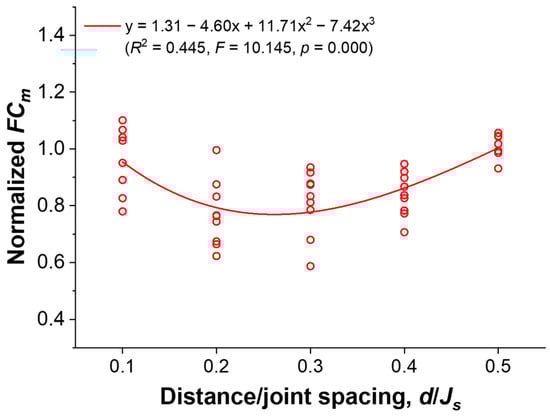 The effect of distance on cutting force, considering joint spacing, was examined by analyzing the correlation between normalized FCm, which represents the ratio of the mean cutting force in jointed rock to that in intact rock under the same cutting depth, and the ratio d/Js was analyzed. As shown in Figure 8, a statistically significant correlation was observed between normalized FCm and d/Js. The R2 value was 0.445, and the F-value exceeded 10, with a p-value of 0.000. These results indicate that the regression curve is statistically significant at the 99% confidence level. According to the regression curve, the normalized FCm reaches its minimum when the ratio d/Js is between 0.2 and 0.3. This suggests that joint effects are most pronounced when d falls within this range, regardless of joint spacing. In contrast, at d/Js = 0.5, the normalized FCm approaches 1 and exhibits low variability. This indicates that joint effects are minimal when cutting is performed at the midpoint between adjacent joint planes. At d/Js = 0.1, the normalized FCm values are distributed near 1, suggesting that the influence of joints is limited even when the cutting path is located very close to a joint plane. Therefore, it can be inferred that joint-induced reductions in cutting force are most significant when the cutting path is located between joints, rather than directly adjacent to one.