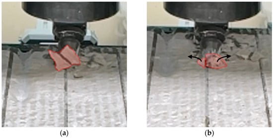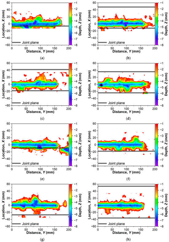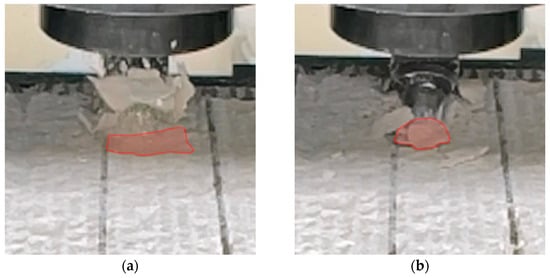 Figure 9 and Figure 10 show contour plots of cutting groove profiles obtained at cutting depths of 6 mm and 9 mm, respectively, for various values of d. It is observed that, regardless of joint spacing and cutting depth, the rock fragmentation zone extends beyond the joint plane when cutting is performed at d = 0.1Js (Figure 9a,e and Figure 10a,e). This phenomenon is clearly illustrated in Figure 11, where rock chips are observed either penetrating across the joint plane (Figure 11a) or forming on both sides of it (Figure 11b), indicating that the joint does not hinder the fragmentation process at this distance. These observations support the trend described in Section 3.1, where the normalized FCm values at d = 0.1Js clustered around 1, implying that joint effects are limited when cutting occurs near the joint plane.