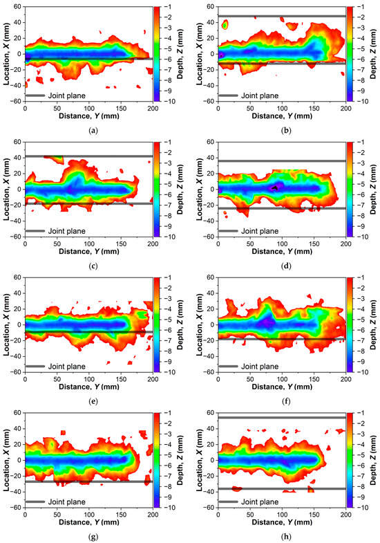 Figure 10. Contour of cutting groove at p = 9 mm: (a) Js = 60 mm, d = 6 mm; (b) Js = 60 mm, d = 12 mm; (c) Js = 60 mm, d = 18 mm; (d) Js = 60 mm, d = 24 mm; (e) Js = 90 mm, d = 9 mm; (f) Js = 90 mm, d = 18 mm; (g) Js = 90 mm, d = 27 mm; (h) Js = 90 mm, d = 27 mm.