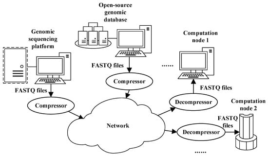 The collection and analysis of genomic data require the cooperation between multiple computation nodes [,,,,]. Genomic data are transmitted between these nodes through a network. Recent research has been focused on the acceleration of genomic analysis [,,,,,,,]. However, the performance of data transmission and storage has not kept up pace with the increase in the genomic data volume in recent years [,,,]. As a result, storage and transmission have become bottlenecks in genomic analysis systems.