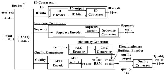 The block diagram of our proposed compressor is shown in Figure 3. The input of our compressor is in the format of an 8-bit ASCII (American Standard Code for Information Interchange) code stream. The compressor consists of seven modules: the FASTQ Splitter, the ID Compressor, the Sequence Compressor, the Quality Compressor, the ID Converter, the Sequence Converter, and the Quality Converter. ‘ID output’, ‘sequence output’, and ‘quality output’ stand for the compression results. ‘ID bits’ and ‘quality bits’ represent the number of valid bits in ‘ID output’ and ‘quality output’. The ‘code_bits’ signal represents a stream of the length of Huffman code words. The output is then processed by the three converter modules, respectively, to extract the valid information and form 64-bit output streams.