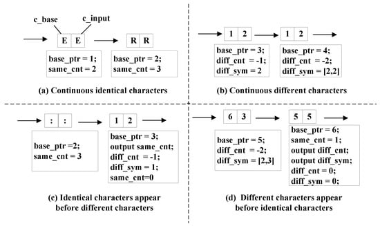 - In Figure 5b, there are continuous different characters. Another 1-byte register ‘diff_cnt’ calculates the number of different characters. Its value is negative to separate itself from the ‘same_cnt’ register. The ‘diff_sym’ register stores the input character. The number of characters contained in ‘diff_sym’ is recorded for future output.
