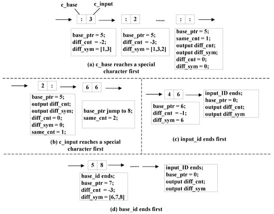 - In Figure 6a, the ‘c_base’ becomes a special character before ‘c_input’. It is a special case of Figure 5d, and it means the same special character will appear after some characters in input_ID because of the high structural similarity. The base_ptr should remain unchanged. The ‘diff_sym’ and ‘diff_cnt’ are required to update continuously until the special character in ‘input_ID’ arrives. The following operations are the same as in Figure 5d.