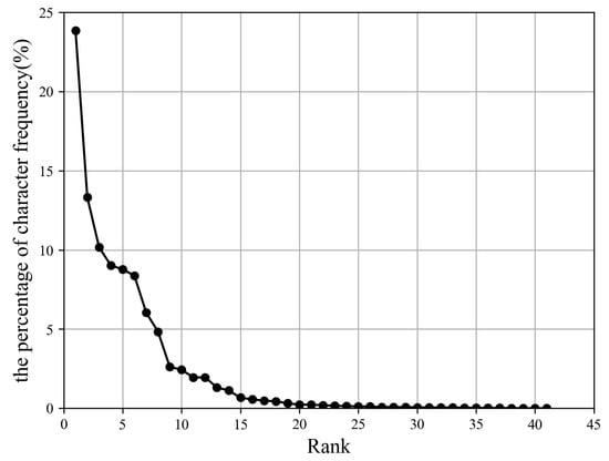There are merely 41 types of characters in the quality part []. The distribution pattern of the quality part is that characters corresponding to higher sequencing accuracy tend to occur with higher frequency []. Figure 10 shows the frequency distribution of characters based on the first 1000 reads of ERR174310_1.fastq. The x-axis represents the rank of the occurrence frequency of the characters in descending order. The y-axis represents the percentage of the character. Table 1 shows the percentage of the top five characters in terms of appearance frequency, where p_error means the probability of error. This distribution pattern can be used to simplify the compression process.