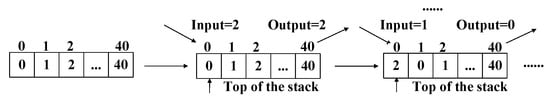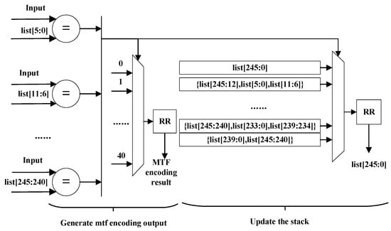 We apply the MTF (move-to-front) transform [] to turn the characters into numbers. An example of the MTF encoding process is shown in Table 2. A stack is maintained to achieve the encoding process. The stack is initialized with incremental integers, starting from 0. The first input signal is 1. This input signal is then looked up in the stack, and its address is returned as the output signal. Element 1 is then moved to the top of the stack. The second input signal is 0. According to the above process, the corresponding output signal is 1. An example of the MTF encoding for quality parts is shown in Figure 11. The basic encoding method is the same as in Table 2.