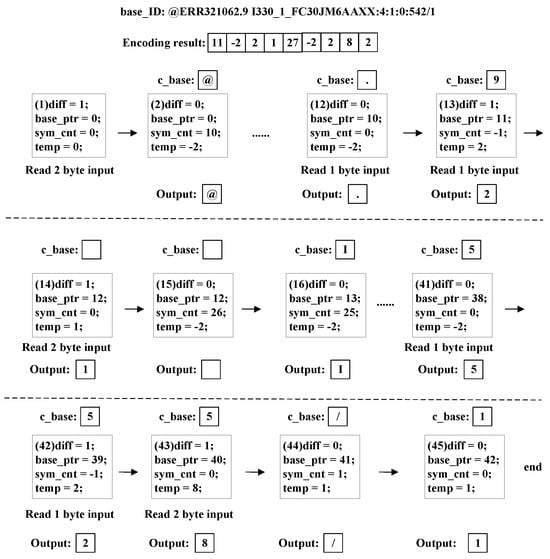 - From Step (14) to Step (40), the encoder encounters continuous identical characters again. Then, ‘same_cnt’ and ‘base_ptr’ register the increase by one in each step.