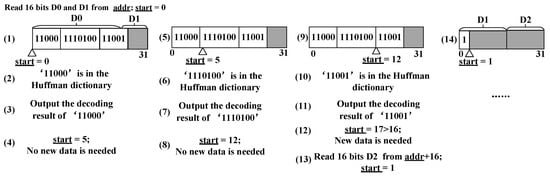 - Shao, Z.; Di, Z.; Feng, Q.; Wu, Q.; Fan, Y.; Yu, X.; Wang, W. A High-Throughput VLSI Architecture Design of Canonical Huffman Encoder. IEEE Trans. Circuits Syst. II 2022, 69, 209–213. [Google Scholar] [CrossRef]