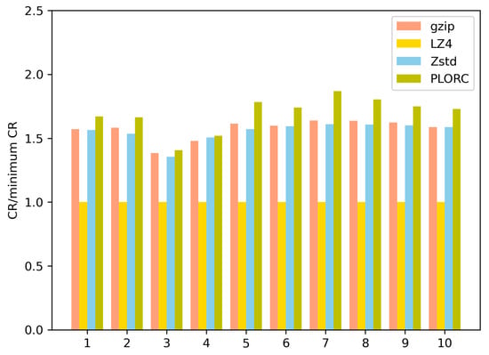 CR comparison of the tested algorithms. The x-axis represents the ‘Dataset Number’ in Table 7. The y-axis means the ratio between the CR of the tested algorithm and the minimum CR on the same dataset.