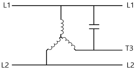The first methodology uses a capacitor to create a phase difference in a single-phase power supply to create a second phase, and the remaining one phase is processed as an imaginary phase. This method operates stably under light loads; however, when the load increases, the output voltage balance and phase stability may be compromised, making it unsuitable for use in a PDS. The second methodology rotates an induction motor with a single-phase power supply to create three phases. The voltage and phase quality are superior to the first method, and it operates stably under heavier loads. However, since this method requires mechanical rotation, it generates noise and incurs maintenance costs. Additionally, its efficiency is relatively low. Furthermore, both the first and second methods convert three-phase 220 V into output voltage, not three-phase 380 V line-to-line voltage. Therefore, if 380 V is required, an additional transformer is also required, making these unsuitable for use with multiple loads connected to the PDS. The principles for the first and second phase conversion methodology are as illustrated in Figure 2 and Figure 3 below.