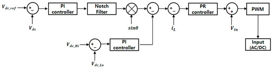 An STPC control employs proportional-integral (PI) control and proportional-resonant (PR) control to ensure compliance with the standard values for voltage, frequency, and Total Harmonic Distortion (THD) in the PDS. Additionally, due to its control function, the STPC not only performs three-phase conversion but also provides voltage regulation. The STPC utilizes phase-by-phase control, where the single-phase input voltage and output voltage are independently regulated for each phase. Figure 6 and Figure 7 illustrate the control block diagrams, which include DC link voltage control, DC link unbalance control, and input current control [20].