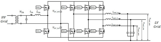The topology is divided into input and output sections. The input section consists of a single-phase half-bridge, and the output section consists of a three-phase full-bridge. Figure 5 shows a simplified topology of STPC. Here, the source is assumed to be a single-phase Pole-mounted Transformer (P.TR), while the LV Grid represents a three-phase LVDS.