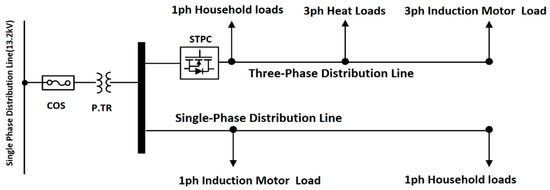 The STPC is connected to the output side of the P.TR in the PDS of the overhead distribution line. Both three-phase and single-phase loads can be connected to the output side of the STPC. Since the LVDS is a radial system, in addition to the STPC line, a separate single-phase line using the existing transformer as a power source can be drawn from the output side of the transformer.