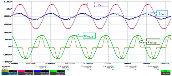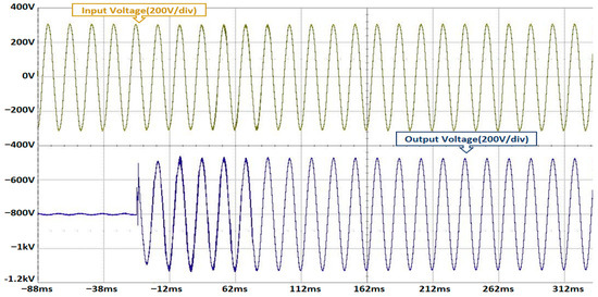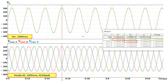 A computer simulation was conducted using PSIM, based on the topology described in Section 3.2. As shown in Figure 11, the input voltage was observed to be 220 V, and the output voltage comprised three waveforms, each with a phase voltage of 220 V.