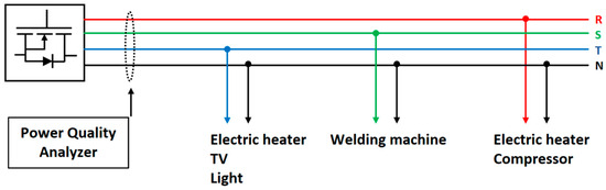 Figure 10 presents a schematic diagram of the test setup used to apply the STPC to a PDS. The test involved connecting various loads—including single-phase household loads, single-phase and three-phase motor loads, and three-phase heating loads—to the three-phase output of the STPC. Additionally, a separate single-phase line, directly connected to the main transformer and not to the STPC output, was included in the setup to evaluate whether the operation of the STPC influenced the PQ of other lines.