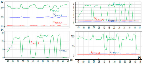Nonlinear loads generate harmonics in the PDS, leading to PQ degradation. Harmonics contribute to increased heating in motors, electrical equipment, and conductors, resulting in operational inefficiencies. In the case of electric motors, inrush currents can cause a significant voltage drop—up to four times the normal current—or lead to the malfunction of other connected equipment [21,22]. Additionally, unbalanced loads result in inefficient power utilization, inducing unbalanced currents in the neutral conductor [23,24].
