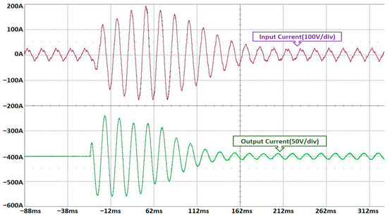 The test results indicated that both the input and output currents of the STPC exhibited an inrush current during motor startup. Specifically, the output current of the R phase reached a peak value of up to 75 and settled to a steady state after approximately eight cycles. Considering the maximum allowable current of the MOSFET elements used in the STPC’s parallel structure, the motor’s inrush current must remain below this limit to ensure safe operation. As shown in the input/output voltage waveforms on the right side of Figure 16, the voltage maintained a relatively stable sinusoidal waveform without noticeable disturbances.