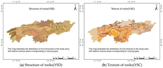 Geological factors have significant influence on landslide occurrence, as diverse geological structures exhibit varying mechanical and chemical properties, structural components, and rainfall infiltration rates. Based on the 1:200,000 Digital Geological Map Spatial Database, the extraction of rock structures (YSD), texture of rocks (YSC), stratigraphic types (DSN), and rock types (YSEB) is crucial in understanding their impacts on slope stability, as is illustrated in the following topographic illustrations, Figure 4a–e, respectively. Simultaneously, data of fault lines were extracted, and the distances to the faults were calculated as one of the influencing factors (shown in Figure 4f).