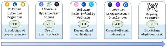 Blockchain technology emerged as a radical innovation underpinning the first decentralized cryptocurrency, Bitcoin []. It has since expanded beyond its initial financial confines, morphing into a foundational technology for a multitude of sectors. Several studies trace the blockchain evolution into five different stages [,,,]. The general overview of the five pivotal stages is shown in Figure 1. The five pivotal stages are as follows: