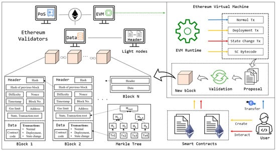 Figure 2 illustrates the workflow and components involved in the Ethereum blockchain, focusing on block creation, validation, and the execution of smart contracts through the Ethereum Virtual Machine (EVM).