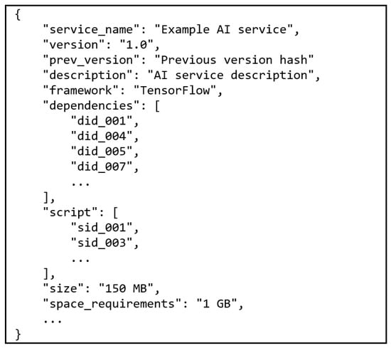 As shown in Figure 3, each block may have zero or more tails attached to it. Each tail stands for the AI service being deployed to the Doctrina network. The tail contains the metadata and service components. The service may be in a containerized form as a self-contained solution or the trained model output files with clear instructions. In both cases, the metadata file is attached to each tail as shown in Figure 4. The metadata includes important information about the AI service and is translated by the permissioned network nodes before approving it. The following is some of the important information extracted from the metadata:
