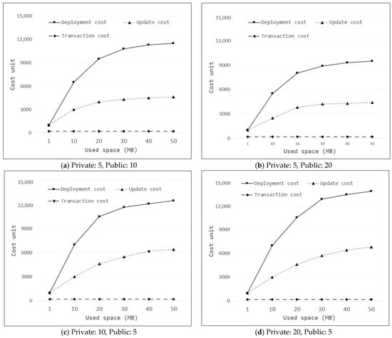 As the amount of used space increases (from 1 MB to 50 MB), we observe a noticeable rise in all three cost components. However, the increase is not uniform across configurations. In Figure 5b, where the public node count is higher, the marginal cost of scaling—especially for deployment and update operations—is slightly reduced compared to Figure 5a. This suggests a form of positive public network externality, where a larger public node base can amortize the costs of storage and validation more effectively across participants.