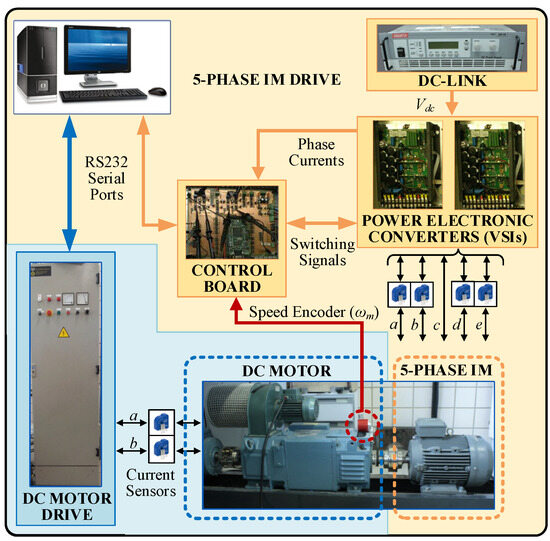 The analyzed system is based on a 5pIM, a five-phase two-level voltage source inverter (5p2L-VSI) constructed from two SEMIKRON SKS 22F modules, and a DC power supply that acts as a DC link (KDC 300-50 from California Instruments Corporation, San Diego, CA, USA). The core of the control unit is an MSK28335 board with a TMS320F28335 digital signal processor model from Texas Instruments (Dallas, TX, USA). The feedback of the mechanical speed signal is provided by the GHM510296R/2500 encoder, while four LH25-NP Hall effect sensors from LEM are used to measure the stator phase-current signals. Note that the 5pIM has an isolated neutral point, a balanced load is assumed (vsa + vsb + vsc + vsd + vse = 0 and isa + isb + isc + isd + ise = 0), and a reduced number of current sensors (four instead of five) is used to obtain the stator phase currents. A DC motor is also used to generate load torque. The system is shown in Figure 1 and Figure 2, where some pictures of the hardware and the schematic diagram of the 5pIM drive are provided.