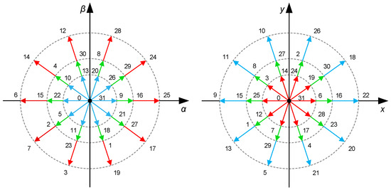 Available voltage vectors in the αβ and xy subspaces, identified by the decimal number derived from the switching vector.