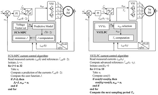 Control schemes for a 5pIM drive using FCS-MPC (left side) and VSTLPC with VVV (right side) techniques.
