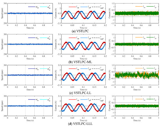 Steady-state response at 300 rpm and 50% of the nominal torque using conventional VSTPLC (a) and the proposed controller with ML-VVV (b), LL-VVV (c), and LLL-VVV (d). From left to right: mechanical speed and αβ and xy stator currents.
