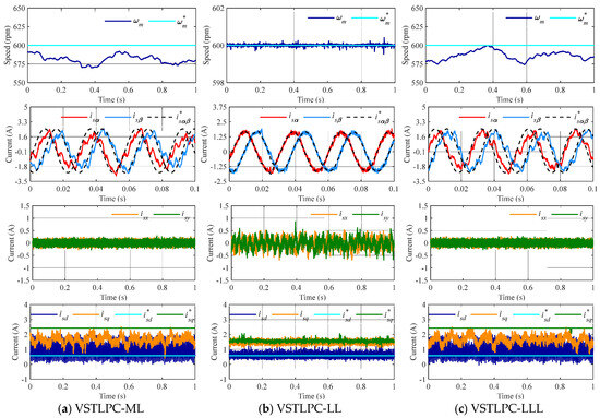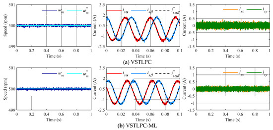 In the first experiment (see Figure 5), a reference speed of 300 rpm (ωm) is imposed, and a load torque (TL) equal to 50% of the nominal is applied. The regulation of speed and the control of the stator current in the αβ plane are achieved effectively in all cases. However, interesting comments regarding the stator current’s performance in the xy subspace must be made. Considering VSTLPC with virtual ML and LLL vectors, a reduction in the xy current components is observed relative to the original VSTLPC technique. This leads to a reduction in the harmonic content of the stator currents and, consequently, to a higher system efficiency, thanks to the use of virtual voltage vectors themselves, which produce an effective open-loop regulation of the xy plane. However, a different situation is observed with the LL virtual vectors, where a non-zero-average xy voltage is imposed and higher xy stator current components appear, as expected. A reference speed of 500 rpm (ωm) is imposed, and a load torque (TL) equal to 85% of the nominal is applied in a second batch of tests (see Figure 6). Again, the regulation of speed and control of the stator current in the αβ plane are achieved effectively in all cases, and the main conclusions achieved in the first experiment are confirmed.